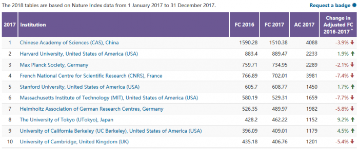 中科院位列2018自然指數(shù)榜單全球十大科研機(jī)構(gòu)首位