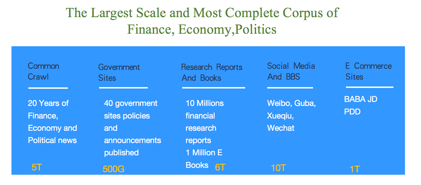 ●BBT-1-1B:10億參數(shù)金融模型,T5Encoder+Decoder架構(gòu),使用金融中文語料庫1000億tokens進行預訓練,包含社交媒體,財經(jīng)新聞,券商研報,公司公告財報等數(shù)據(jù)