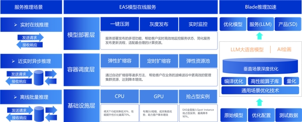PAI EAS模型在線服務(wù)+Blade推理加速,幫助客戶一站式解決AI部署和推理的全部環(huán)節(jié)。