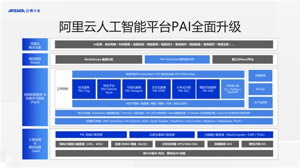 人工智能平臺(tái)PAI在4.0版本里,下層是強(qiáng)大的基礎(chǔ)設(shè)施,中間層“PAI靈駿智算集群”,是專門面向超大規(guī)模分布式,重點(diǎn)解決預(yù)訓(xùn)練、Finetune、推理等工作。最上層“Model as a Service”概念,能夠讓不懂算法,但需要應(yīng)用AI的人進(jìn)行全鏈路的AI創(chuàng)新。