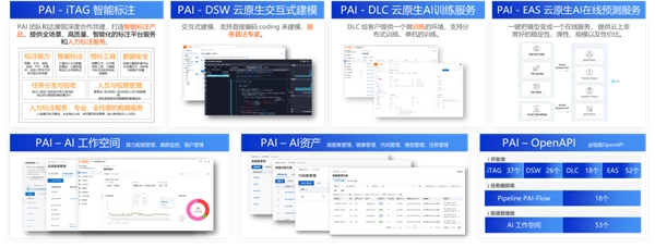 阿里云人工智能平臺(tái)PAI作為全生命周期優(yōu)化的AI平臺(tái),包含iTAG智能標(biāo)注、DSW交互式建模、DLC AI訓(xùn)練服務(wù)、EAS在線預(yù)測(cè)服務(wù)、AI工作空間、AI資產(chǎn)、OpenAPI等服務(wù),打造一體化全鏈路的AI工程平臺(tái),全面提升行業(yè)、產(chǎn)業(yè)落地效率