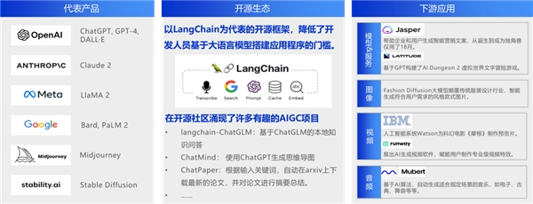 在整個(gè)市場(chǎng)當(dāng)中,AIGC領(lǐng)域可以分為三類:預(yù)訓(xùn)練大模型、開源生態(tài)和下游應(yīng)用。