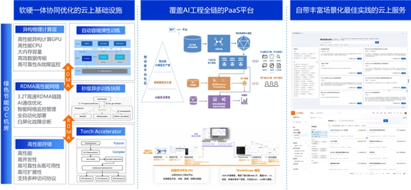 1、軟硬一體協(xié)同優(yōu)化云上基礎(chǔ)設(shè)施,把高性能網(wǎng)絡(luò)、高性能存儲(chǔ)和高性能計(jì)算的能力和編譯優(yōu)化能力、容錯(cuò)訓(xùn)練能力、快速異步checkpoint的能力相結(jié)合,提供極致且穩(wěn)定的環(huán)境,供大家可以高效訓(xùn)練大模型。