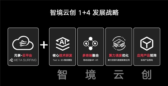 為推動空間計算時代的業(yè)務(wù)持續(xù)升級,王智武提出了智境云創(chuàng)新階段“1+4”發(fā)展戰(zhàn)略,即1個平臺+4個發(fā)展方向。1個平臺代表智境云創(chuàng)自研的元享智能云平臺,4個方向分別是邁向人工智能的“智”;實現(xiàn)多終端融合,在VR、AR、MR場景構(gòu)建生態(tài)的“境”;構(gòu)建云算力調(diào)度平臺,基于云算力、云渲染發(fā)力2C市場的“云”。同時,將積極推進海外市場布局,扎根于北京,輻射全球,將技術(shù)、產(chǎn)品、應(yīng)用推廣到北美、中東、東南亞等地區(qū)。