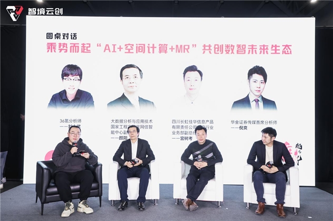 發(fā)布會最后,36氪資深分析師劉士武與中關(guān)村大數(shù)據(jù)產(chǎn)業(yè)聯(lián)盟副秘書長顏陽教授、長虹佳華教育行業(yè)業(yè)務(wù)部副總經(jīng)理宮樹考、華金證券傳媒首席分析師倪爽,圍繞「乘勢而起,“AI×MR×空間計算”,共創(chuàng)數(shù)智未來生態(tài)」主題展開了精彩紛呈的圓桌討論。
