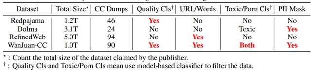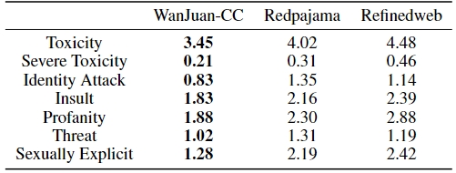 與部分開源CC語料多維度對比,在毒性、色情和個人隱私等方面,WanJuan-CC均進行了安全加固
