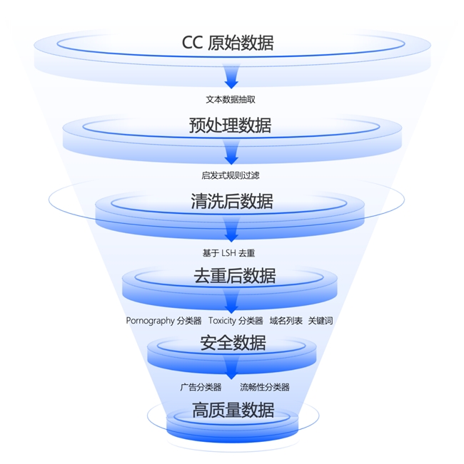 為從浩如煙海的CC數據庫中“精選”最可靠的信息,研究團隊搭建了高性能分布式數據處理基礎設施,通過啟發(fā)式規(guī)則過濾、多層級數據去重、內容安全過濾、數據質量過濾等四個步驟,從原始數據中“萃取”出高質量數據,數據留存率僅為原數據的1.38%。
