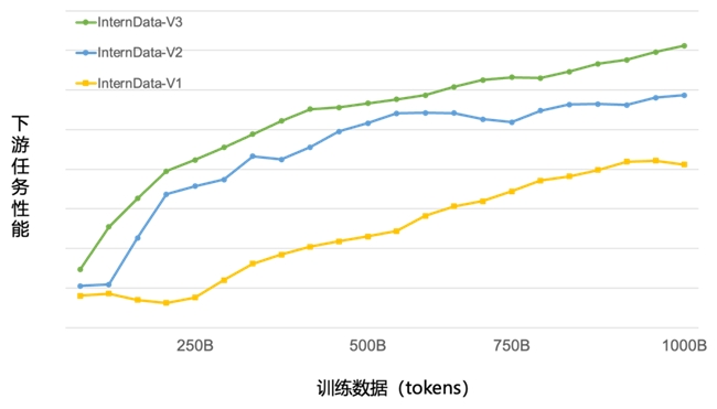 綠色曲線為InternLM2使用WanJuan-cc作為預訓練語料,在不同數據規(guī)模上取得的任務性能分布,結果顯示,WanJuan-CC可大幅提升模型訓練效率