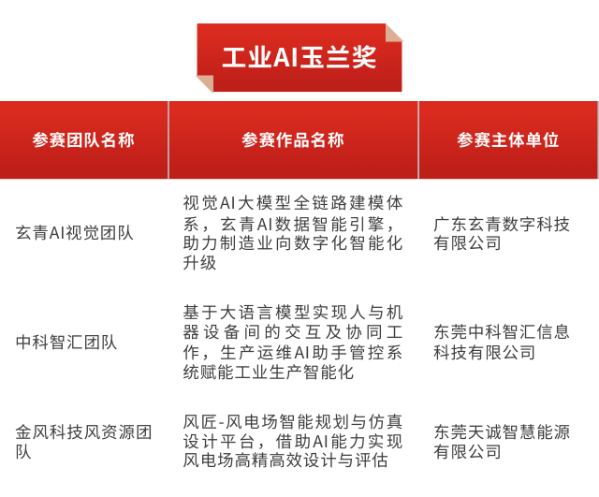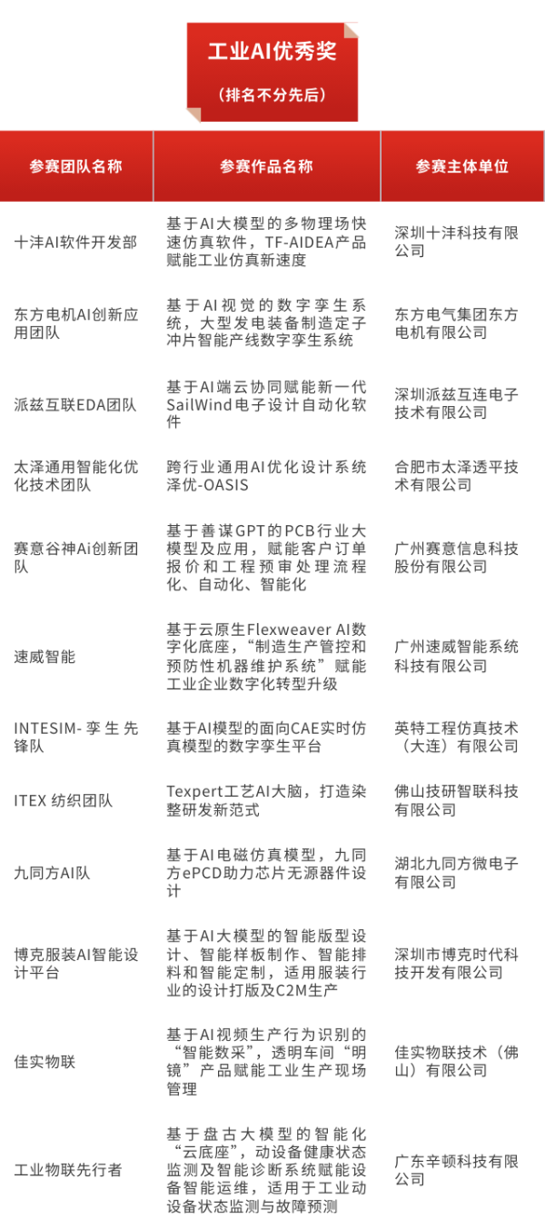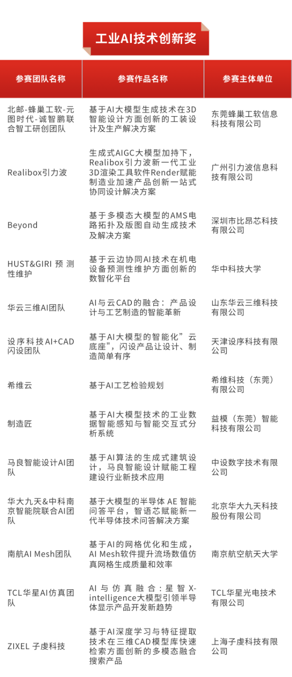 據(jù)悉,本屆大賽由東莞市人民政府主辦,東莞市工業(yè)和信息化局、東莞濱海灣新區(qū)管理委員會聯(lián)合數(shù)字化工業(yè)軟件聯(lián)盟(廣東省數(shù)字化學會)共同承辦,華為云計算技術(shù)有限公司協(xié)辦,于2024年9月線上啟動,剛發(fā)布即獲得產(chǎn)業(yè)界高度關(guān)注。大賽圍繞工業(yè)及其支柱產(chǎn)業(yè)的各業(yè)務(wù)環(huán)節(jié)(包含但不限于研發(fā)、采購、供應(yīng)、制造、營銷、維護等),聚焦設(shè)計、仿真、工藝、制造、管理流程優(yōu)化、數(shù)字孿生與工業(yè)互聯(lián)網(wǎng)等領(lǐng)域的創(chuàng)新實踐,面向全國征集新一代工業(yè)軟件產(chǎn)品或解決方案,包括AI for 設(shè)計、AI for仿真、AI for工藝、AI for制造、AI for管理全流程優(yōu)化、AI for數(shù)字孿生與工業(yè)物聯(lián)網(wǎng)等范圍。初賽吸引來自全國共98家團隊報名參與,并最終遴選41個創(chuàng)新實踐產(chǎn)品及解決方案進入決賽。12月4日至12月6日,經(jīng)過2天半的激烈角逐,決賽最終誕生技術(shù)創(chuàng)新獎13名,應(yīng)用場景創(chuàng)新獎13名,玉蘭獎3名,優(yōu)秀獎12名。